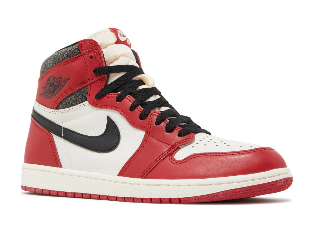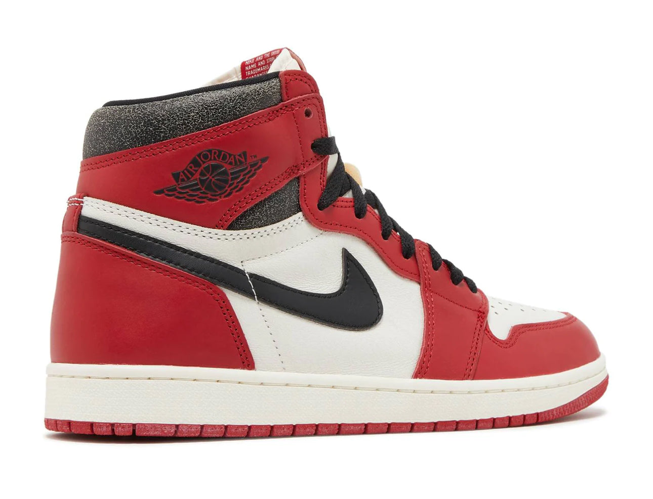 The Air Jordan 1 Retro High OG ‘Chicago Lost & Found’ brings back the iconic silhouette that started it all. Featuring the high-cut shape of the original 1985 release, the leather upper combines a white base with a black signature Swoosh and scarlet overlays at the forefoot and heel. Cracked black leather appears on the padded collar, while a vintage pre-yellowed finish is applied to the white rubber midsole. The vintage ‘80s aesthetic extends to the special packaging, highlighted by a damaged box plastered with sale stickers and topped with a mismatched replacement lid. An accompanying sales invoice is emblematic of a time when the Air Jordan 1 lingered on the shelves of mom and pop stores, eventually making their way into the hands of lucky customers at a steep discount.