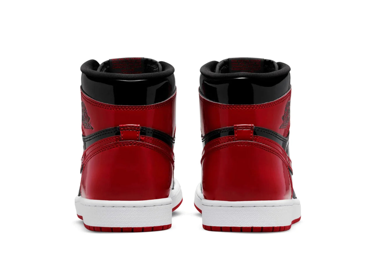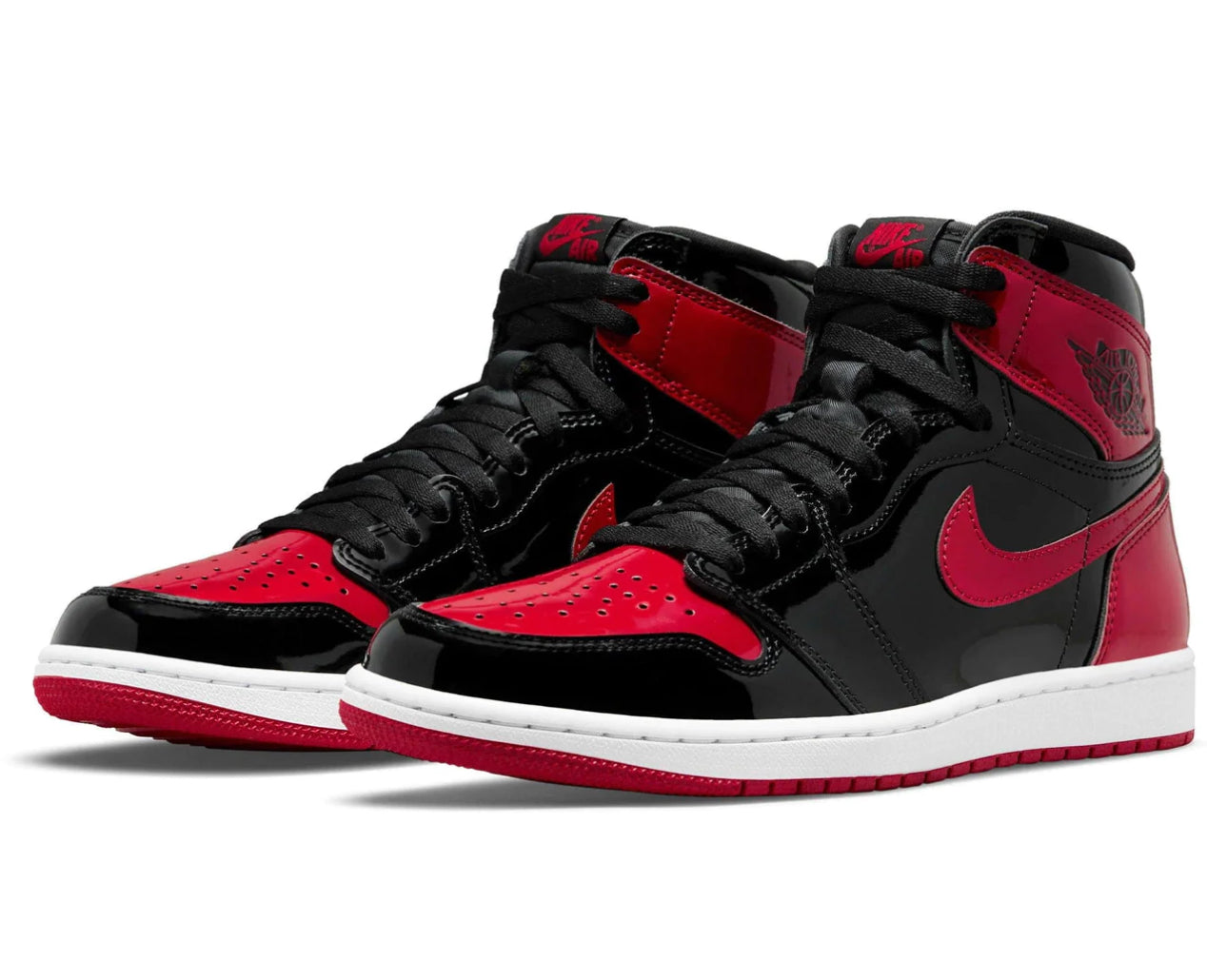 The Air Jordan 1 Retro High OG ‘Patent Bred’ treats the iconic colorway to a glossy makeover. Aside from the shoe’s patent leather construction, the essential design DNA remains intact. The upper pairs basic black paneling with contrasting hits of Varsity Red on the toe box, Swoosh, heel overlay and collar flap. A woven Nike tag adorns the black nylon tongue, while a Wings logo is stamped on the lateral collar. The high-top rides on a sturdy rubber cupsole, enhanced with an Air-sole unit encapsulated in lightweight polyurethane.