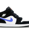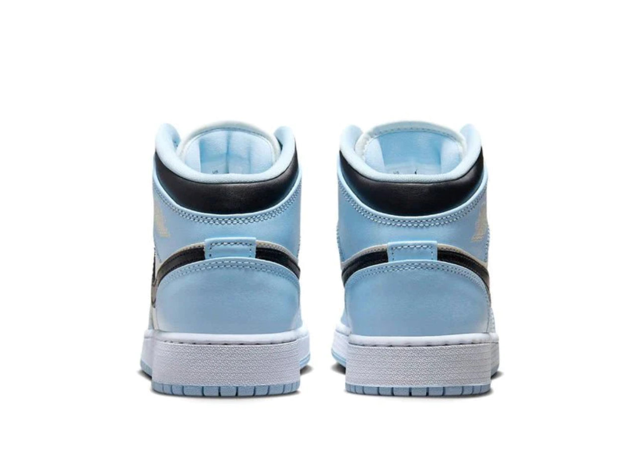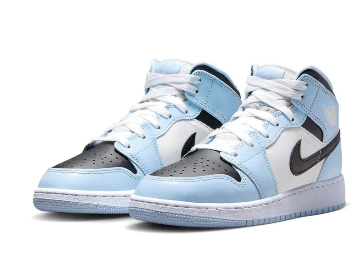 The Air Jordan 1 Mid GS ‘Ice Blue’ has an all-smooth-leather upper. The base is two-toned, with black covering the toe box, white on the mid-panels and black again on the collar underlay. This black-and-white look is joined by the titular Ice Blue colour on the toe cap, the mudguard, the eye stay panel and the heel counter. The signature profile Swooshes on both the medial and the lateral sides of the shoe are black, matching the toe box and collar. Angelic white Wings logos are embossed on the lateral collar flaps. A pure white midsole and an Ice Blue rubber outsole wrap up the look of this shoe.