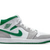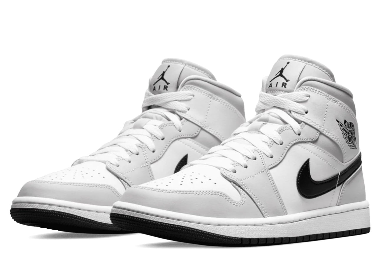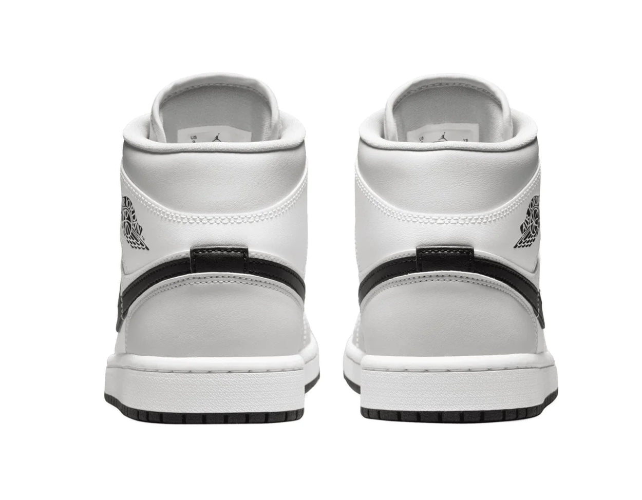 This offering of the mid-top Air Jordan 1 comes constructed in a full leather build featuring a White and Light Smoke Grey base paired with Black detailing on its branded areas. Crisp White laces and midsole atop a Black rubber outsole completes the design.