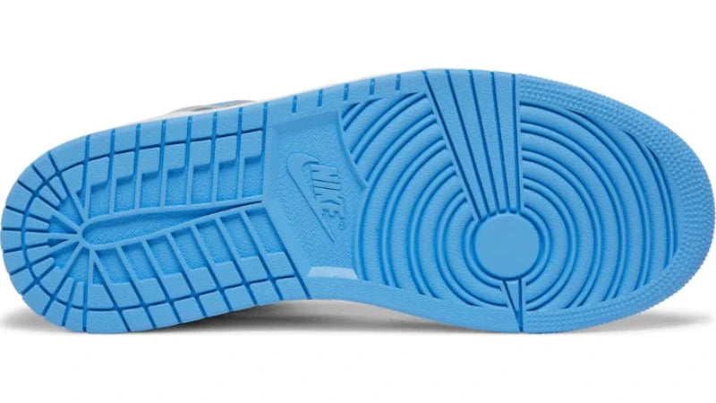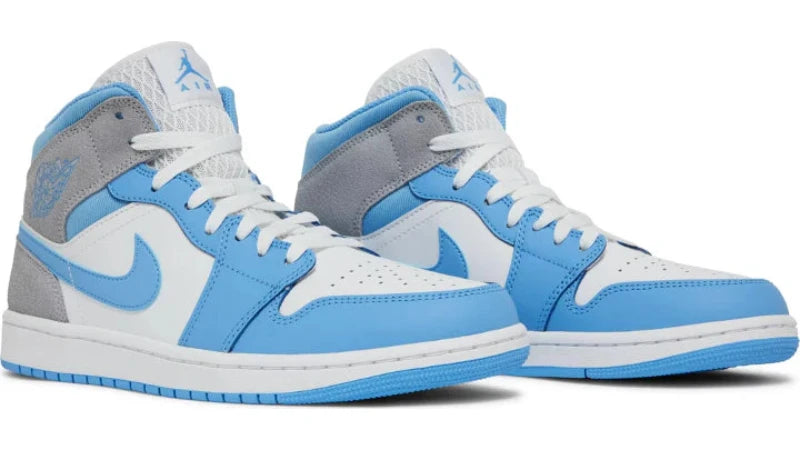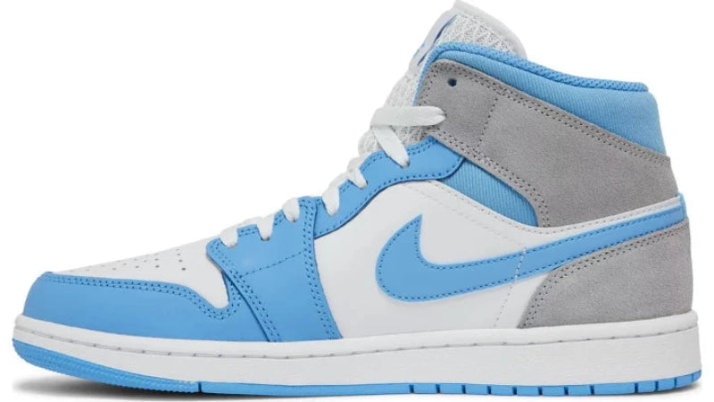 The Air Jordan 1 Mid ‘University Blue Grey’ has a blue outsole, white midsole, and then matching panelling on the upper. The toe cap, eyelets, Swooshes and ankle are painted in blue, with the ankle coming in a canvas material rather than the leather, whilst the heel and Wings panelling come in a grey suede.